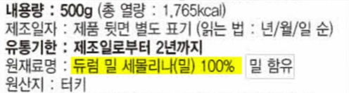 파스타를 구입할때는 뒷면의 성분표를 보고 듀럼밀100%를 구입하면된다.