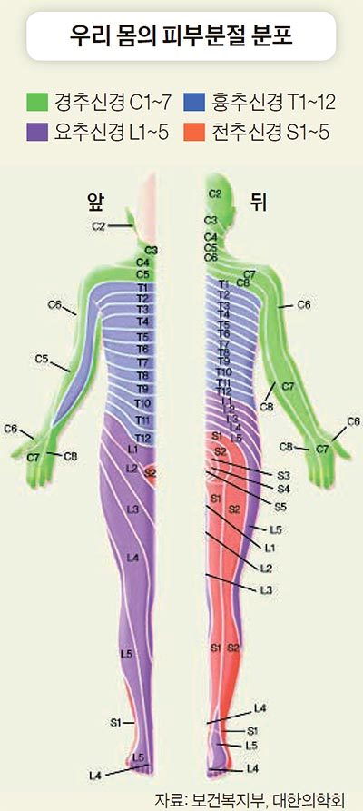 - 사람의 신경세포 배열은 띠 모양의 피부분절로 이루어져 있는데, 이 대상포진은 이 분절을 따라 발생함.
